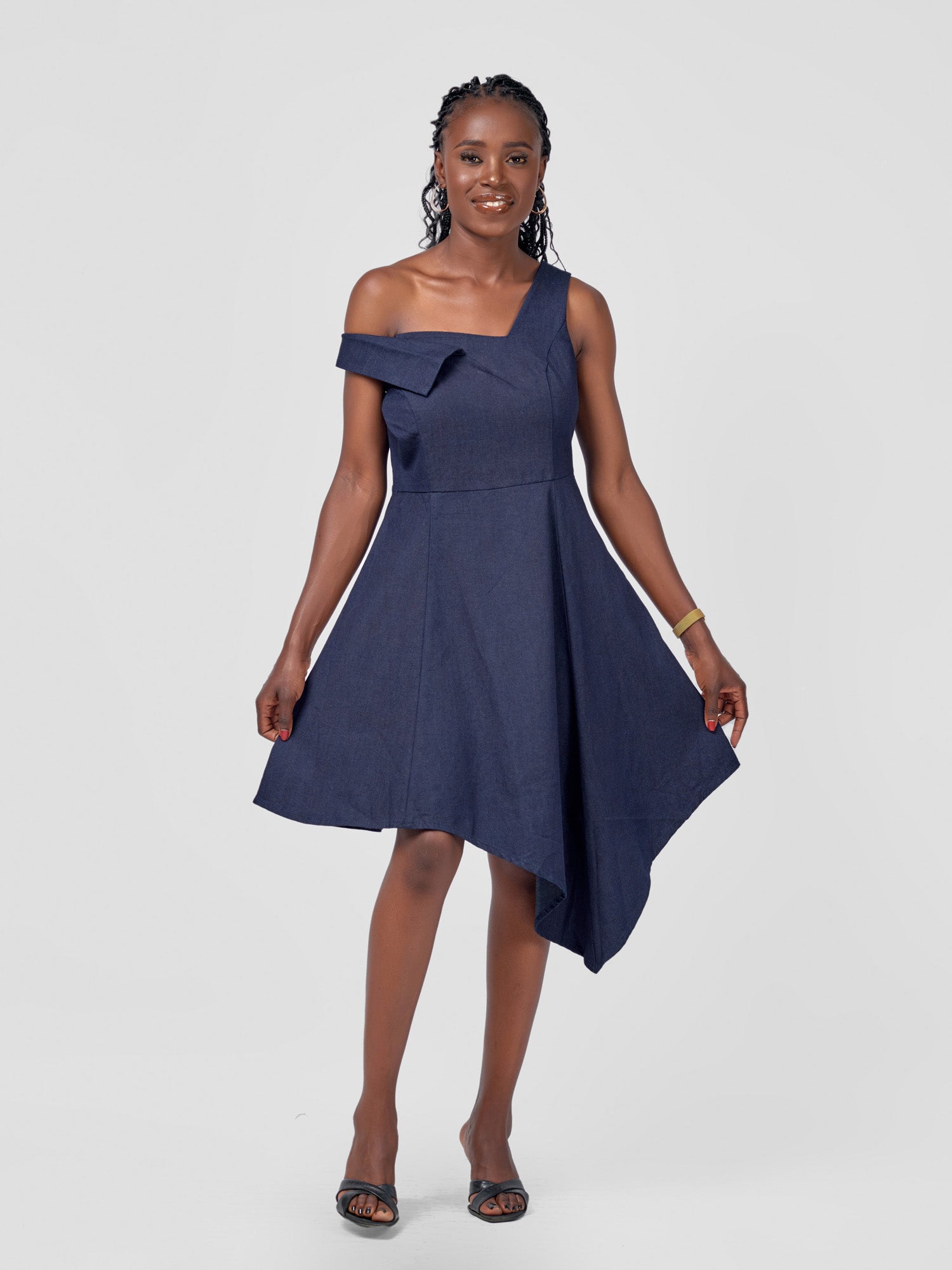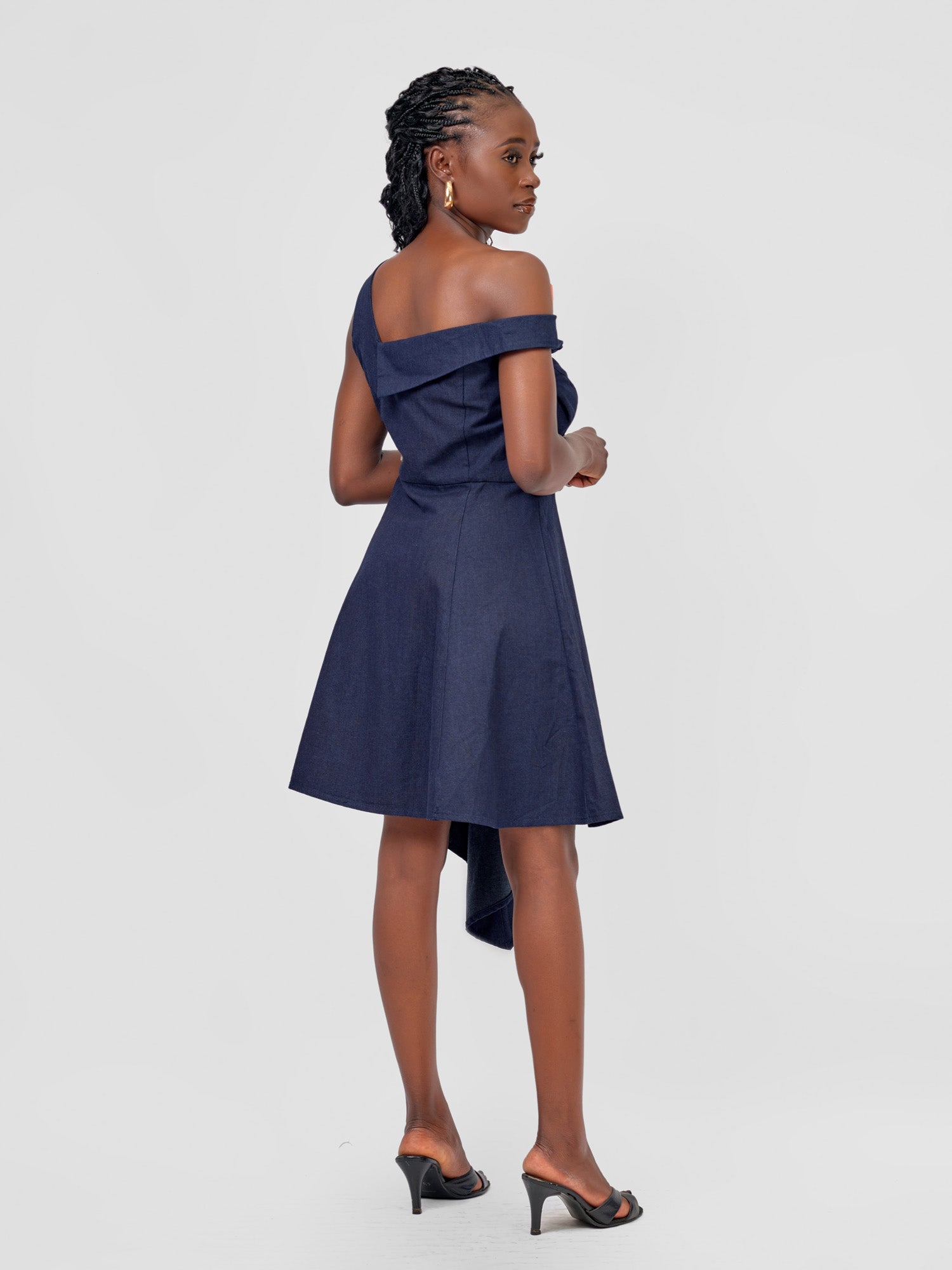 This off-shoulder, asymmetrical dress in dark denim fabric has a modern, elegant design with one shoulder strap. It falls to knee length with a unique draped hemline, blending a timeless denim look with contemporary flair.