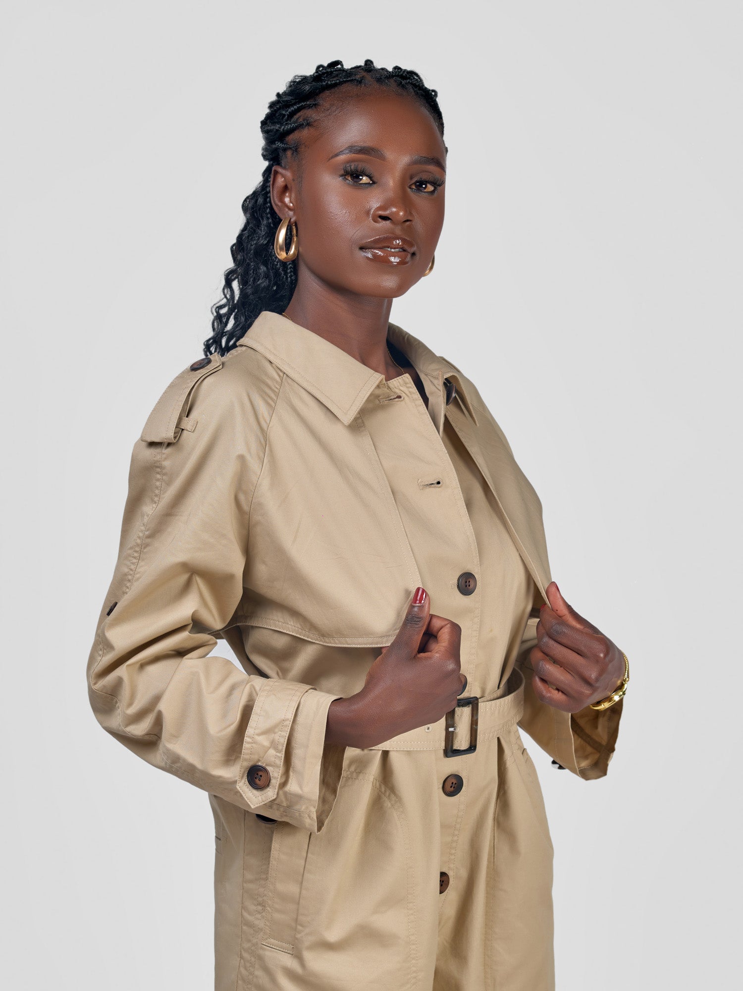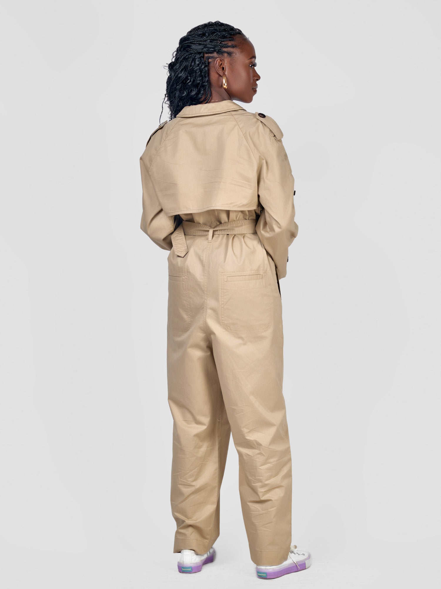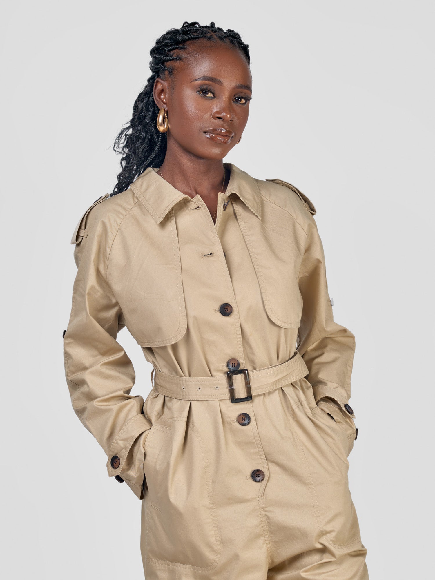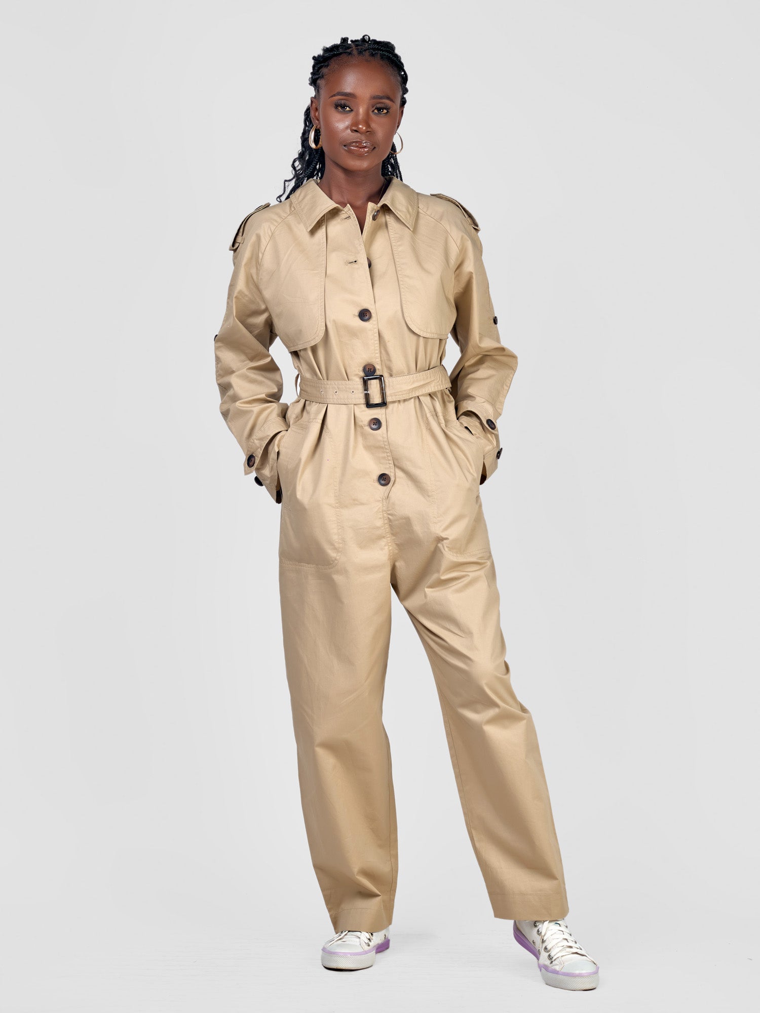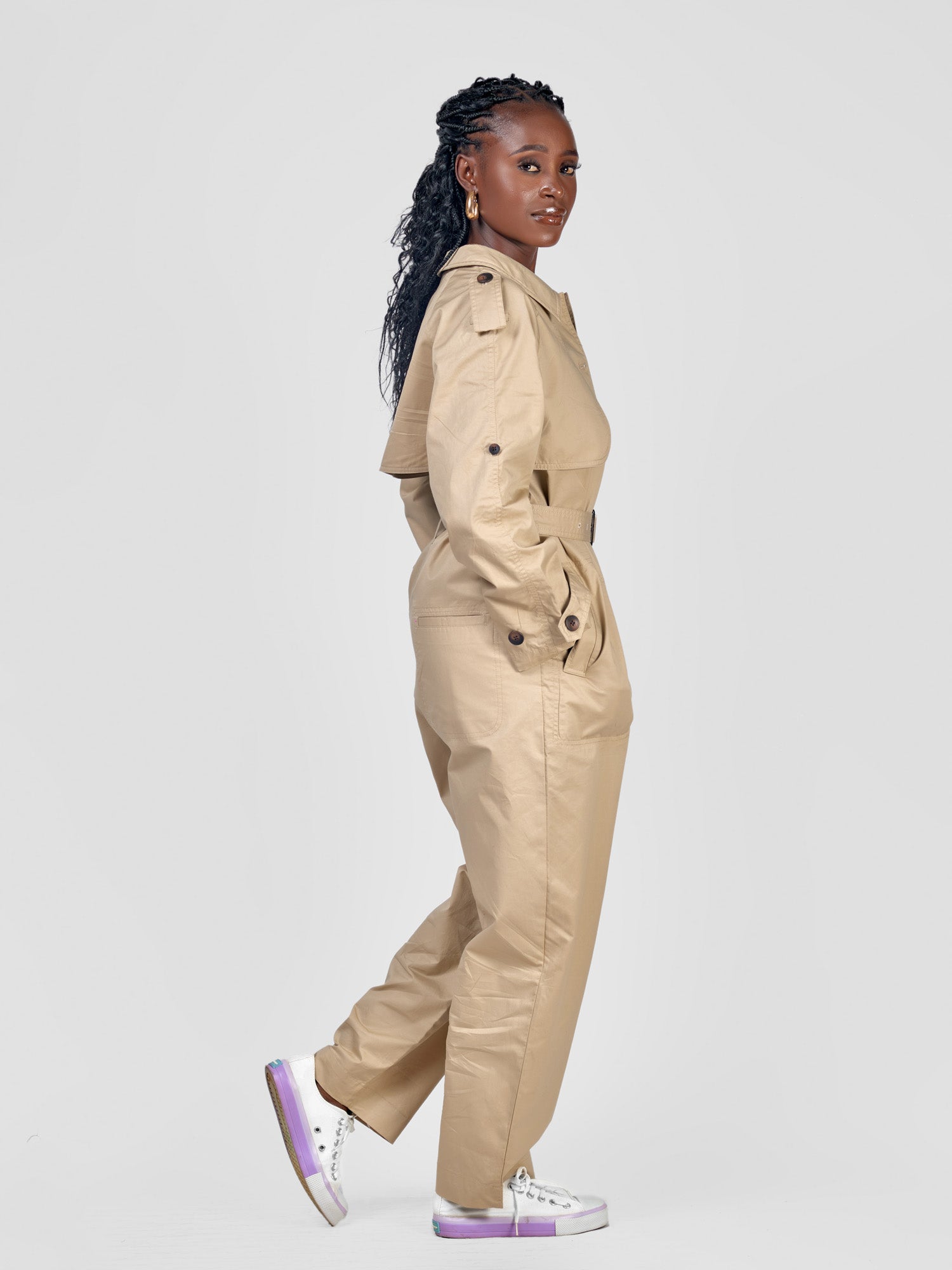 Embrace a rugged yet refined look with this beige utility jumpsuit. Featuring functional shoulder flaps and a matching belt to cinch the waist, it offers a structured silhouette with a utilitarian edge. Perfect for versatile styling, it’s a modern wardrobe essential that blends comfort with style.